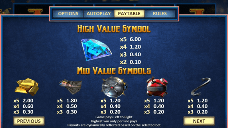 สิ่งที่ฉันชอบเกี่ยวกับคุณสมบัติที่รวมอยู่ที่นี่ก็คือคุณสมบัติเหล่านั้นไม่ใช่คุณสมบัติจากสล็อตอื่นๆ ตัวอย่างคือโอกาสในการ Detonate Wilds ซึ่งเกิดขึ้นทุกๆ 10 สปิน Take The Bank ถือเป็นเกมก้าวหน้าซึ่งคุณเล่นในรอบ 10 สปิน สำหรับการหมุนแต่ละครั้งที่คุณกระตุ้น Master Bomb Counter จะเลื่อนนาฬิกานับถอยหลังจาก 10 เป็น 0 สัญลักษณ์ Robber ใด ๆ ที่คุณได้รับจะถูกรวบรวมและกลายเป็นระเบิด ซึ่งจะเปลี่ยนเป็นไวด์หลังจาก การหมุน 10 ครั้ง ตามที่ฉันได้กล่าวไปแล้ว ไอคอน Robber จะกลายเป็น Wild Bombs เมื่อพวกมันปรากฏขึ้น พวกมันจะอยู่รอบๆ แล้วระเบิดเมื่อครบ 10 รอบเพื่อรับรางวัลมากมาย เมื่อสิ่งนั้นเกิดขึ้น ไวด์จะถูกเคลียร์และมีการ หมุนอีก 10 ชุดที่จะเริ่มต้น Wilds ถูกใช้แทน โดยทำงานถัดจากสัญลักษณ์ปกติใดๆ ข้อยกเว้นคือพวกโจรและรถตำรวจ หากคุณได้รับไวลด์ห้าตัวเพื่อสร้างคอมโบของตัวเอง พวกเขาจะจ่ายมากเท่ากับสัญลักษณ์เพชรในตำแหน่งเดียวกัน เพื่อเข้าถึง 15 ฟรีสปินของสล็อต คุณจะต้องมีรถตำรวจสามคันกระจายอยู่บนวงล้อตรงกลาง การนับถอยหลังจะหยุดชั่วคราว หลังจากนั้นคุณเริ่มหมุนฟรี ในโหมดนี้ คุณมี Epic Wilds 5 ถึง 10 อันบนวงล้อ โดยเปลี่ยนตำแหน่งหลังจากแต่ละรอบ