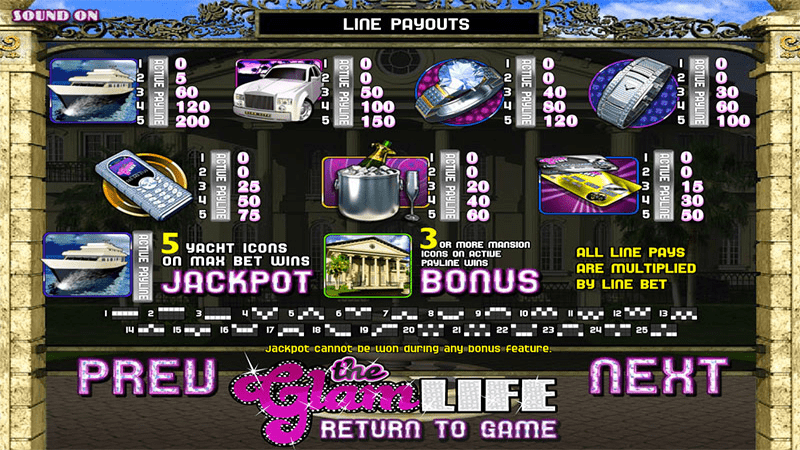 The Glam Life เป็นเกมสล็อต 3 มิติแบบ 5 รีล 30 เพย์ไลน์ ที่จะแนะนำให้คุณรู้จักกับชีวิตที่เต็มไปด้วยความมั่งคั่งและความฟุ่มเฟือย เกมสล็อตคุณภาพสูงและมีความคมชัดสูงจาก BetSoft ช่วยให้คุณสามารถขึ้นเครื่องบินเจ็ตส่วนตัวของคุณเพื่อพักผ่อนช่วงสุดสัปดาห์ เข้าไปในคฤหาสน์ของคุณด้วยรถยนต์สุดหรู และแม้แต่จิบแชมเปญราคาแพงบนเรือยอชท์ของคุณ เพลิดเพลินไปกับทุกสิ่งที่ดีกว่าในชีวิตพร้อมสร้างรายได้จากการเล่นสล็อตวิดีโอออนไลน์เกมดังกล่าวเข้ากันได้กับระบบปฏิบัติการ แล็ปท็อป/คอมพิวเตอร์ Windows, Mac และ Linux แต่ปัจจุบันยังไม่มีให้เล่น บนมือถือ บางทีคุณสมบัติที่น่าดึงดูดที่สุดของ Glam Life ก็คือแจ็คพอตแบบโปรเกรสซีฟ The Glam Life เป็นหนึ่งในแจ็คพอตแบบโปรเกรสซีฟของ BetSoft ที่ได้รับการคัดเลือกเกมสล็อต Glam Life มีพื้นฐานมาจากการใช้ชีวิตที่อุดมสมบูรณ์และหรูหรา ซึ่งเป็นสิ่งที่คนส่วนใหญ่ใฝ่ฝัน เกมดังกล่าวช่วยให้คุณใช้ชีวิตเหมือนคนรวยในขณะที่คุณนั่งเครื่องบินเจ็ตและบินไปยังจุดหมายปลายทางที่คุณเลือกหรือพักผ่อนบนเรือยอชท์ของคุณในขณะที่จิบเงินที่ดีที่สุดที่สามารถซื้อได้ สัญลักษณ์ต่างๆ จะเป็นไปตามความคาดหวังสูงสุดของคุณ ได้แก่ เครื่องบินเจ็ตส่วนตัว แชมเปญ แมนชั่น แหวนเพชร นาฬิกาจากดีไซเนอร์ สร้อยคอราคาแพง ขวดน้ำหอม บัตรเครดิต และเรือยอชท์ The Glam Life มีแจ็คพอตมาตรฐานที่เปิดโอกาสให้ผู้เล่นได้ รับเงินรางวัล 37,500 ดอลลาร์